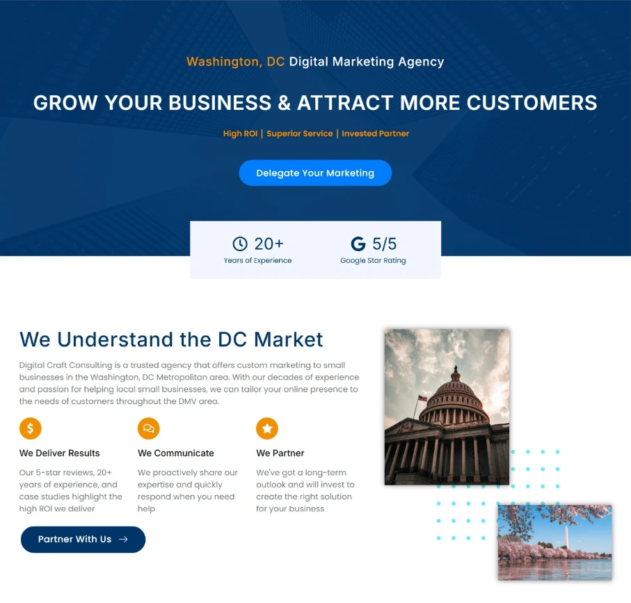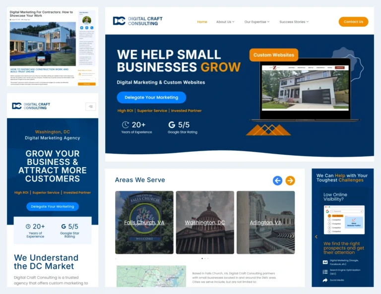 To promote Digital Craft Consulting to their local service area, I designed and developed a set of city landing pages that covered 9 locations throughout the DC Metropolitan Area. After building a page template in Elementor Pro that highlighted the company’s differentiators, expertise, services, and social proof, I used Advanced Custom Fields (ACF) to tailor each page to its specific city with unique content such as a local success story featuring a client from that city/area.